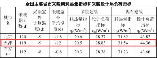 根據(jù)《全國(guó)主要城市采暖期耗熱量指標(biāo)和采暖設(shè)計(jì)熱負(fù)荷指標(biāo)》,天津地區(qū)節(jié)能建筑每平方米采暖季供暖所需熱量為28.83w/㎡*24h*119d/1000≈82.34kwh/㎡
