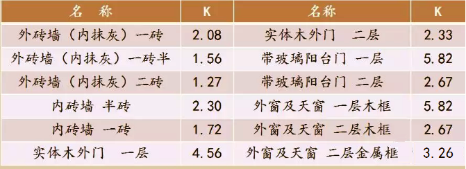 常用圍護(hù)結(jié)構(gòu)傳熱系數(shù)K(W/(㎡.℃))