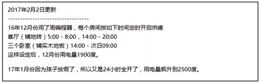 16年12月份每個房間分時開啟供暖?蛷d(鋪地磚)5:00 - 8:00,14:00 - 20:00;三個臥室(鋪實木地板),14:00 - 次日09:00。這樣設(shè)定后,12月份用電量1900度。