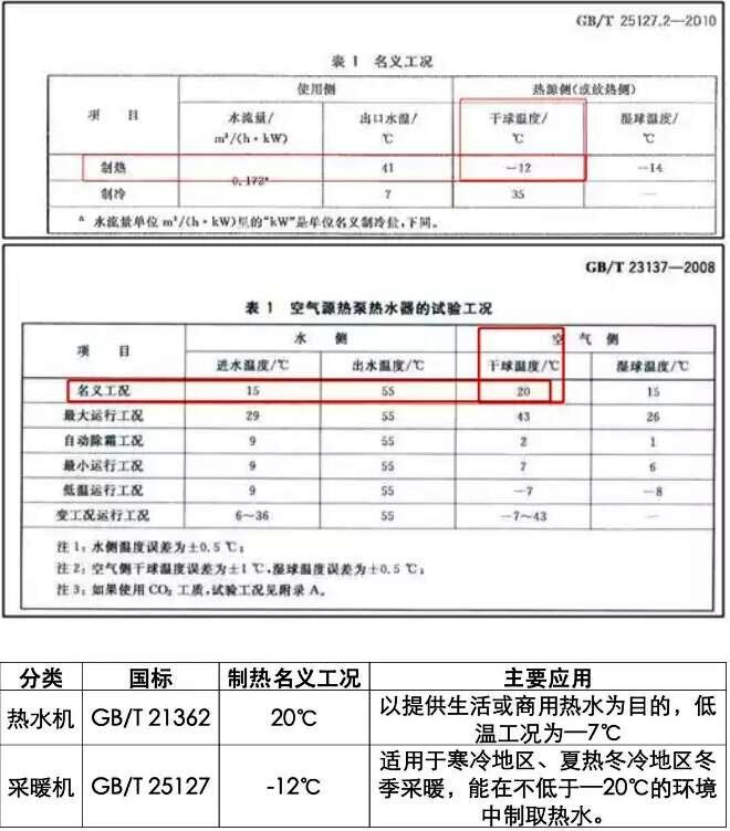 空氣源熱泵熱水器(GB/T 21362)側(cè)重于熱水,設(shè)計工況干球溫度20℃,進(jìn)出水溫15-55℃,最高水溫60℃,不適用于寒冷地區(qū)、夏熱冬冷地區(qū)冬季采暖。
