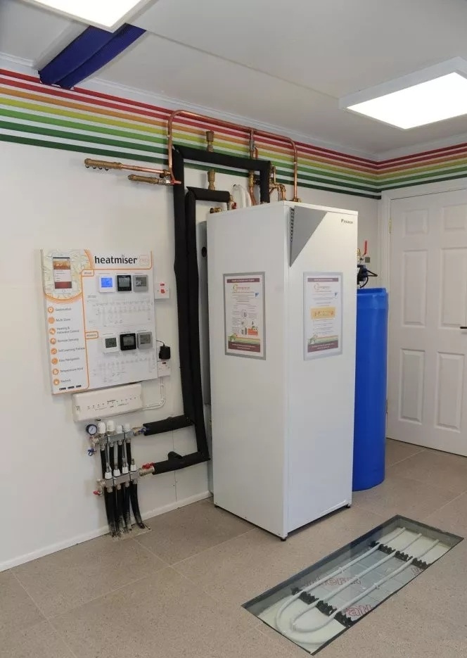 (圖中最左邊)空氣源熱泵系統(tǒng)的室外風機;(圖中最右邊)空氣源熱泵系統(tǒng)的室內(nèi)風機。