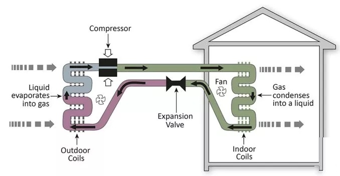 Expansion Valve(膨脹閥)、Outdoor Coils(室外換熱器)、Liquid evaporates into gas(液體蒸發(fā)成氣體)、Compressor(壓縮機)、Fan(風扇)、Gas condenses into a liquid(氣體凝結成液體)、Indoor Coils(室內(nèi)換熱器)