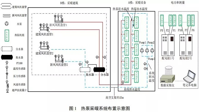 如圖1所示,由于醫(yī)院樓房改造等因素,熱泵機(jī)組及其附屬設(shè)備置于A樓樓頂,距離采暖建筑B樓約15m,兩者之間由供回水管連接?諝庠礋岜貌膳到y(tǒng)布置如圖1所示,采暖熱水至采暖建筑B樓分為2路,分別為建筑供暖和新風(fēng)供暖。