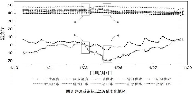 如圖3中c區(qū)域所示,出現(xiàn)測量周期內(nèi)最冷天氣,日平均溫度為-6.90℃,單臺熱泵供水溫度均值48.6℃,系統(tǒng)總供/回水建筑、新風(fēng)供水、單臺熱泵供/回水溫度均出現(xiàn)下降,而建筑回水和新風(fēng)回水溫度基本不變,其日均值分別是42.6℃和41.5℃。