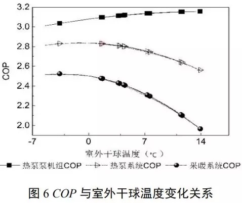 如圖6所示,室外干球溫度與系統(tǒng)性能指標(biāo)總結(jié)為以下3點: