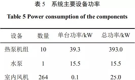 系統(tǒng)主要設(shè)備功率如表5所示,單臺熱泵機(jī)組功率為39.3kW;單臺水泵功率為15.5kW;室內(nèi)風(fēng)機(jī)共264臺,風(fēng)機(jī)總功率為25kW。由于室外干球溫度升高,室內(nèi)供暖需求減少,熱泵機(jī)組運行數(shù)量減少,使得采暖水泵和室內(nèi)風(fēng)機(jī)等占主要運行能耗。系統(tǒng)能效變化原因分析有以下2點: