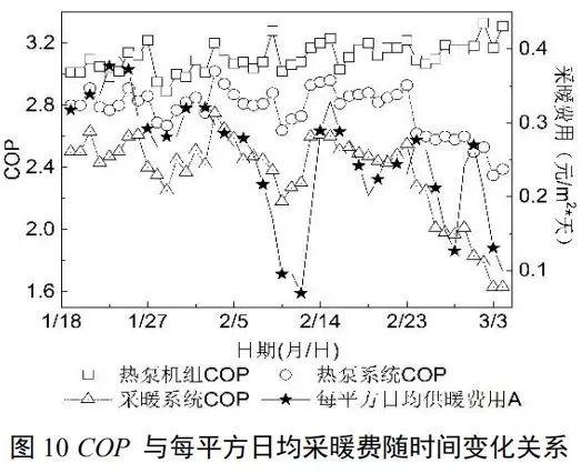 3 ) 整個冬季采暖測試過程中,機(jī)組高負(fù)荷時期,日均消耗3,943kWH;機(jī)組低負(fù)荷時期,日均消耗696kWH;整個測量周期內(nèi),日均耗電量平均值為2,559kWH,每平方米日均耗電為0.29kWH,每天每平方米采暖費用為0.25元。在夏熱冬冷地區(qū),熱泵機(jī)組采暖工況條件適宜,能滿足經(jīng)濟(jì)性和舒適性要求。