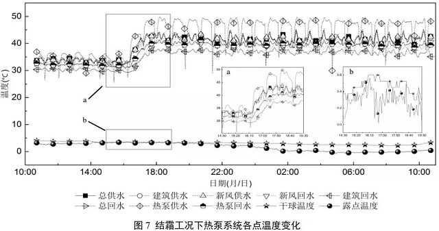 觀察圖7中a和b區(qū)域,16:24時,空氣濕度降低,此時總供水溫度為31.3℃;16:54時,熱泵系統(tǒng)總供水溫度首次達(dá)到40.3℃;17:36時,回水溫達(dá)到40.2℃,表明熱泵系統(tǒng)開始穩(wěn)定運行,此時環(huán)境溫度3.41℃,露點溫度0.12℃。熱泵系統(tǒng)在結(jié)霜時,可保持總供水溫度保持在33.0℃附近,但達(dá)不到設(shè)定值要求溫度(44.0℃)。