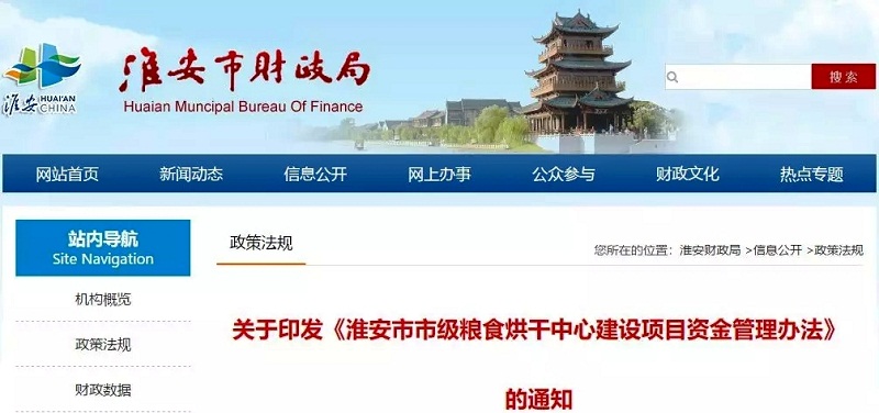 2018年7月2日,淮安市財(cái)政局、市農(nóng)機(jī)局聯(lián)合印發(fā)《淮安市市級糧食烘干中心建設(shè)項(xiàng)目資金管理辦法》,支持項(xiàng)目資金采取先建后補(bǔ)支持方式,每個(gè)烘干中心補(bǔ)助額不超過10萬元。原則上同一主體已享受過市級財(cái)政烘干中心建設(shè)項(xiàng)目資金補(bǔ)助的不再支持。