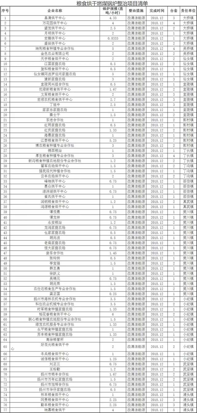 2018年4月20日,揚(yáng)州市江都區(qū)人民政府辦公室下達(dá)了《關(guān)于2018年度糧食烘干燃煤鍋爐整治工作任務(wù)的通知》,指出為全面整治高污染燃料糧食烘干爐,年底前完成全區(qū)糧食烘干燃煤鍋爐淘汰或?qū)嵤┣鍧嵞茉刺鎿Q(初步調(diào)查的77家134臺(tái)名單如下圖)。除《糧食烘干燃煤鍋爐整治項(xiàng)目表》中所列出的鍋爐,所有遺漏的或統(tǒng)計(jì)后新增的烘干燃煤鍋爐,必須納入各鎮(zhèn)整治范圍。對今后新建的糧食烘干爐,必須使用清潔能源。
