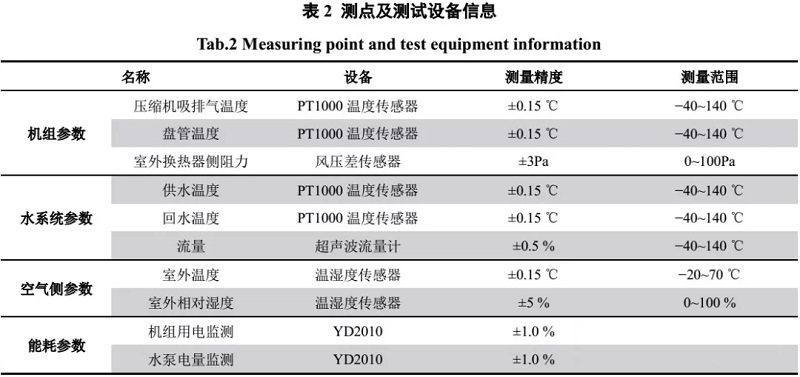 設(shè)置自動(dòng)監(jiān)測(cè)系統(tǒng),對(duì)空氣源熱泵系統(tǒng)機(jī)組及水泵關(guān)鍵參數(shù)進(jìn)行實(shí)時(shí)監(jiān)測(cè),主要包括:室外參數(shù)、系統(tǒng)實(shí)際運(yùn)行參數(shù)、系統(tǒng)基本能耗等。以上數(shù)據(jù)均通過計(jì)算機(jī)實(shí)時(shí)讀取存儲(chǔ),存儲(chǔ)頻率1次/min。具體測(cè)點(diǎn)及相應(yīng)測(cè)試設(shè)備精度如表2所示: