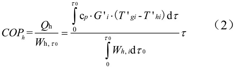 式中:T0為時(shí)間,S;Qs為T0時(shí)間內(nèi)熱泵系統(tǒng)的總供熱量,kJ;Wh,r0為T0時(shí)間內(nèi)熱泵機(jī)組的耗功量,kJ;Ww,r0為T0時(shí)間內(nèi)循環(huán)水泵的耗功量,kJ;cp為水的比熱容,取為4.2;Gi系統(tǒng)循環(huán)水質(zhì)量流量,kg/s;Wh,i為i時(shí)刻熱泵機(jī)組功率,kW;Ww,i為i時(shí)刻循環(huán)水泵功率,kW;Tgi和Thi分別是i時(shí)刻系統(tǒng)供回水溫度,℃。