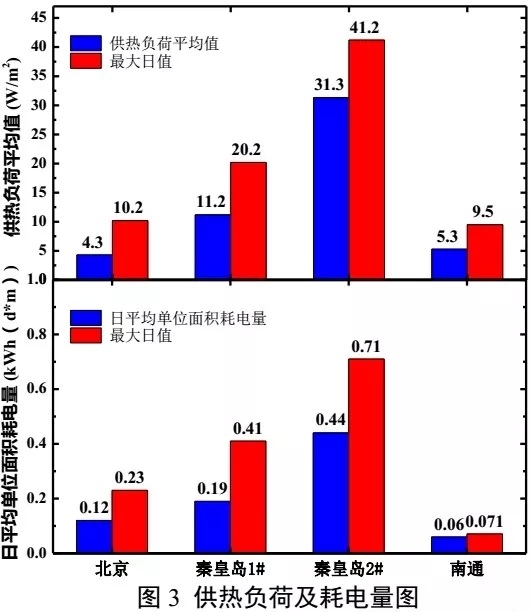 圖3為各項(xiàng)目的實(shí)測(cè)平均供熱負(fù)荷及耗電量,北京某辦公樓、秦皇島1#辦公樓、秦皇島2#辦公樓、南通某辦公樓項(xiàng)目供熱負(fù)荷平均值分別為4.3、11.2、31.3、5.3W/平方米,供熱負(fù)荷最大日測(cè)試值分別為10.2、20.2、41.2、9.5W/平方米。