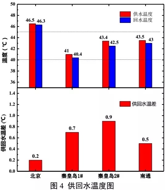 圖4所示為各項(xiàng)目供暖季系統(tǒng)平均供回水溫度,北京某辦公樓、秦皇島1#辦公樓、秦皇島2#辦公樓、南通某辦公樓項(xiàng)目的供回水溫度均值分別為46.5/46.3℃、41/40.4℃、43.4/42.5℃、43.5/43℃,供回水溫度差值分別為0.2℃、0.7℃、0.9℃、0.5℃,供回水溫差均遠(yuǎn)遠(yuǎn)小于設(shè)計(jì)5℃溫差,“大流量小溫差”現(xiàn)象明顯。在實(shí)際運(yùn)行過程中,除存在秦皇島2#辦公樓項(xiàng)目人為調(diào)節(jié)溫度設(shè)定值值外,其他項(xiàng)目的日平均供回水溫度值固定不變,供暖系統(tǒng)水溫設(shè)定點(diǎn)在實(shí)際運(yùn)行時(shí)缺乏調(diào)節(jié)。