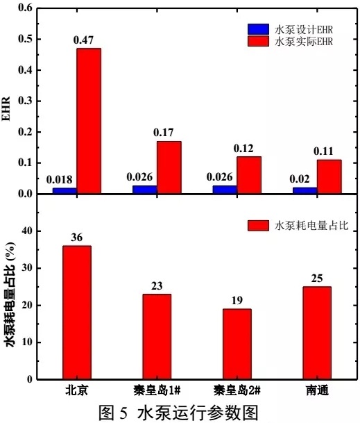 圖5為各項(xiàng)目水泵設(shè)計(jì)和實(shí)際EHR,以及水泵耗電量占比圖。由圖可得,北京某辦公樓、秦皇島1#辦公樓、2#辦公樓、及南通某辦公樓項(xiàng)目的輸配系統(tǒng)在測(cè)試期內(nèi)的耗電輸熱比分別為0.47、0.17、0.12、0.11,遠(yuǎn)遠(yuǎn)高于水泵設(shè)計(jì)EHR。測(cè)試期內(nèi),四個(gè)項(xiàng)目水泵耗電量占系統(tǒng)耗電量比例分別為36%、23%、19%、25%。水泵能耗占比過大,是COPsh值低下的重要原因。
