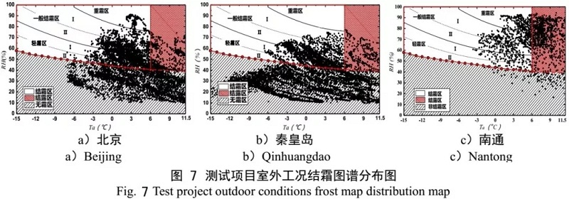 各項(xiàng)目室外工況在結(jié)霜圖譜分布如圖7所示,由此可見,北京和秦皇島地區(qū)室外工況較為干燥,超過50%室外工況位于非結(jié)霜區(qū),位于結(jié)霜區(qū)的工況僅占43%和32%,極少有重霜區(qū)工況。南通地區(qū)室外氣溫相對(duì)較高,但其相對(duì)濕度較大,約30%的室外工況位于一般結(jié)霜區(qū)和重霜區(qū)。由此可見,不同氣候區(qū)室外工況差異較大,機(jī)組應(yīng)按照室外溫濕度情況按需除霜,但是目前實(shí)際工程多采用溫度-時(shí)間(TT)除霜控制方法,該除霜控制方法未考慮不同氣候區(qū)的環(huán)境工況差異性,導(dǎo)致“誤除霜”事故頻發(fā)。