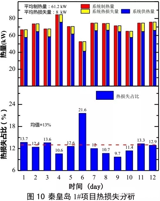 圖10為試驗(yàn)測(cè)試結(jié)果,由圖可知,試驗(yàn)期間系統(tǒng)制熱量平均值為61.2kW,供熱量平均值為53.2kW,熱損失量平均值為8kW,熱損失量占系統(tǒng)總制熱量的13%,最高日可達(dá)21.6%,造成了嚴(yán)重能量浪費(fèi)。