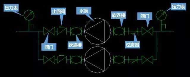 (出水側)閥門—止回閥—軟連接—水泵—軟連接—Y型過濾器—閥門(進水側)