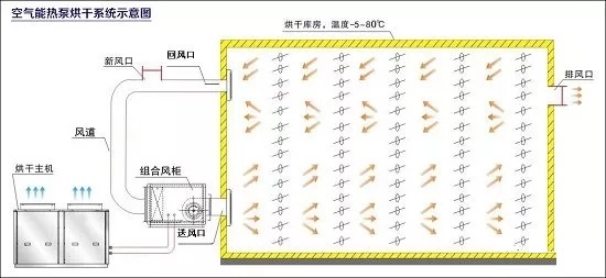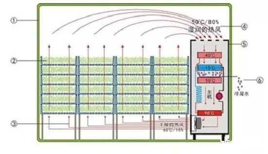 熱泵烘干系統(tǒng)包括空氣源熱泵主機(jī)、烘干房內(nèi)循環(huán)風(fēng)機(jī)、風(fēng)道和勻風(fēng)板、物料架以及托盤等部分構(gòu)成。