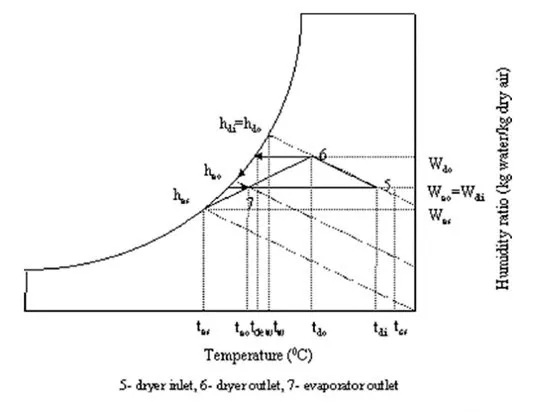在干燥空氣回路中,我們可以發(fā)現(xiàn),新鮮干燥熱空氣狀態(tài)如圖二所示5點(diǎn),進(jìn)入干燥室?guī)ё咚謱?shí)現(xiàn)干燥過程。之后從干燥室排出的濕廢氣6進(jìn)入蒸發(fā)器,濕空氣溫度在蒸發(fā)器附近降低至露點(diǎn)溫度,水分開始凝結(jié)并從空氣中分離,達(dá)到除濕的目的,空氣狀態(tài)達(dá)到7點(diǎn)。