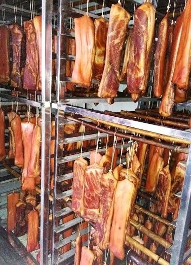 所謂穿流式就是風(fēng)至上而下或者自下而上的穿過物料的風(fēng)道結(jié)構(gòu)形式,穿流式廣泛運(yùn)用于懸掛類物料的烘干,如臘肉、香腸、板鴨、等肉制品及面條、粉條、煙葉等掛起來更能保持形狀的物料。