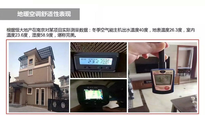 恒大地產(chǎn)在南京對某項(xiàng)目進(jìn)行了實(shí)際測量,得出地暖空調(diào)運(yùn)行時室內(nèi)的溫濕度數(shù)據(jù):冬季空氣能主機(jī)出水溫度40℃,地表溫度26.3℃,室內(nèi)溫度23.6℃、濕度58.9℃,可以說是非常舒適的生活環(huán)境,深刻體現(xiàn)了地暖空調(diào)的舒適性。