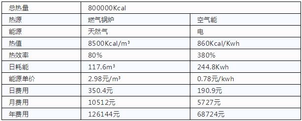 拋開(kāi)系統(tǒng)設(shè)計(jì)的因素外,熱水提升同樣的溫度需要的熱量是一致的,所以,我們大致可以計(jì)算出超低溫空氣源熱泵熱水器和燃?xì)忮仩t在提升同樣溫度的水時(shí)要消耗的能量。成都非居民用氣價(jià)格為2.98元/m3,非居民用電價(jià)格為0.78元/度,則我們可以估算出一年下來(lái)兩種熱源的運(yùn)行能耗數(shù)據(jù)。見(jiàn)下表。
