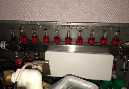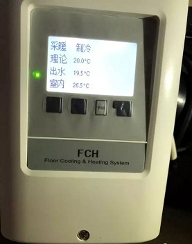 在分集水器前端加裝了混水中心,全自動化調(diào)節(jié)地暖供水溫度,實現(xiàn)氣候補償技術(shù)。室內(nèi)裝有中央控制器,溫濕度露點控制面板,夏季地板可制冷,處理圍護結(jié)構(gòu)負荷,實現(xiàn)露點保護技術(shù)。室外部分PUN601離心泵,影響混水閥出水的準(zhǔn)確度,更換為PUN200離心泵泵,降低外置水泵對混水閥的影響,同時降低了運行能耗。二次側(cè)只用一臺15-8的高效泵負責(zé)末端循環(huán),調(diào)試時分集水器流量計顯示3L/min說明地暖側(cè)水流量充足。