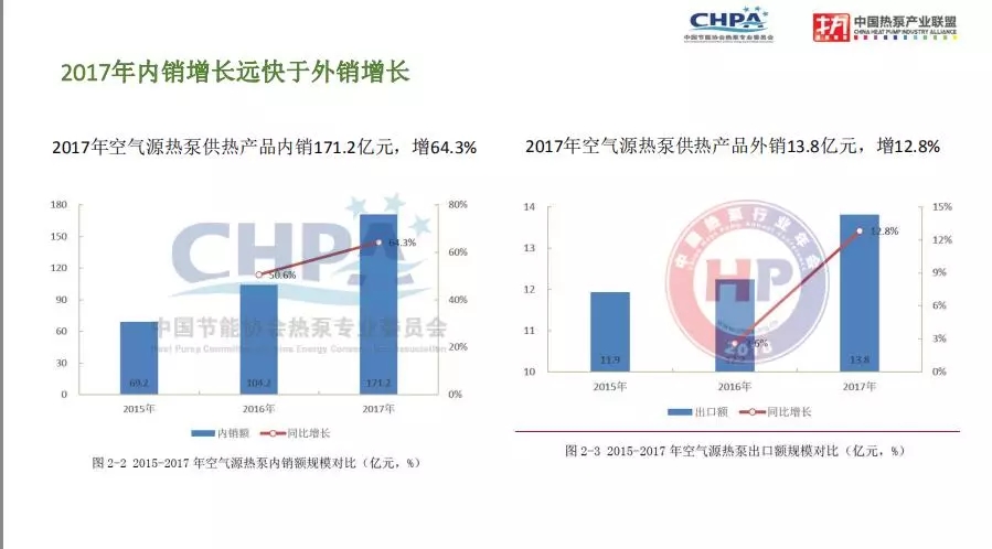 補充一點,2017年我國空氣源熱泵供熱產(chǎn)業(yè)實現(xiàn)了高速增長,主要源于內銷市場的拉動,2017年空氣源熱泵供熱產(chǎn)品內銷171.2億元,內銷增長幅度為64.3%,2017年空氣源熱泵供熱產(chǎn)品外銷13.8億元,外銷增長幅度為12.8%,主要是內銷增長拉動整個行業(yè)的增長。