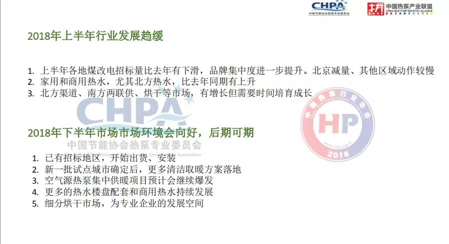 2017年我國空氣源熱泵供熱產(chǎn)業(yè)取得非常好的成績,但是在2018年上半年行業(yè)發(fā)展趨緩,整機制造企業(yè)壓力非常大,源于2018年上半年煤改電的招標總量與去年相比有所下降,品牌的集中度迅速提高。具體北京地區(qū)冬季清潔取暖工程空氣源熱泵產(chǎn)品市場需求量比去年有所降低,河北、山東、山西等其他區(qū)域工作開展比較慢,且市場比較分散,給空氣源熱泵整機企業(yè)帶來非常大的壓力。但2018年后半年市場環(huán)境會向好,市場前景依然可期。尤其是北方地區(qū)清潔取暖新一批試點城市公布之后,更多的清潔取暖方案將落地。此外,空氣源熱泵集中供暖項目在2018年后半年也將迎來市場旺季,集中供暖市場將為商用低溫空氣源熱泵機組等產(chǎn)品帶來市場會在后半年持續(xù)爆發(fā)。在生活熱水領域,越來越多的精裝樓盤選擇使用空氣源熱泵產(chǎn)品實現(xiàn)生活熱水的配套,還有就是細分的烘干市場,如淤泥、煙業(yè)的烘干市場都將為專業(yè)空氣源熱泵企業(yè)提供良好的細分的發(fā)展空間。