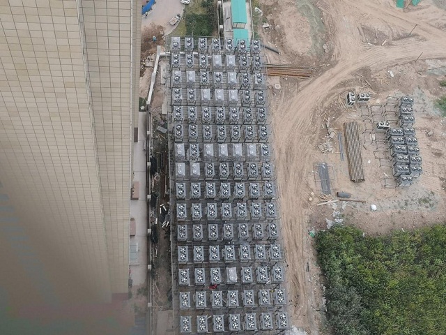 與傳統(tǒng)的鍋爐熱源不同,空氣源熱泵通過“搬運”室外空氣中儲存的熱量到室內(nèi)來達(dá)到供暖目的,空氣流通量及空氣溫度決定了最終的有效熱量。該項目的最大困難就是社區(qū)最初并未預(yù)留足夠場地擺放空氣源主機,最終僅留出72×16(最初64×16)米場地(正常來說需要約2畝地擺放主機),同時南面及東面有建筑物圍擋,嚴(yán)重限制了機組通風(fēng)及擺放自由度,對于140臺機組而言就是災(zāi)難!