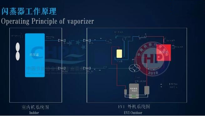 閃蒸器原理則是通過一次節(jié)流降壓后,從而導(dǎo)致部分液態(tài)制冷劑蒸發(fā),通過制冷劑蒸發(fā)后帶走熱量,從而提高剩余液態(tài)制冷劑過冷度。蒸發(fā)后的制冷劑通過連接管進(jìn)入壓縮機繼續(xù)壓縮,進(jìn)入循環(huán)。同時,板換式經(jīng)濟(jì)器與閃蒸器兩種方式相比,其制熱效果通過實驗對比,能力能效沒有明顯的差異。