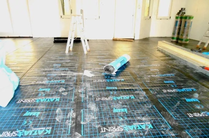 圖為地暖地面構(gòu)造中,最底層的防水隔潮膜的鋪設(shè)施工現(xiàn)場(chǎng)