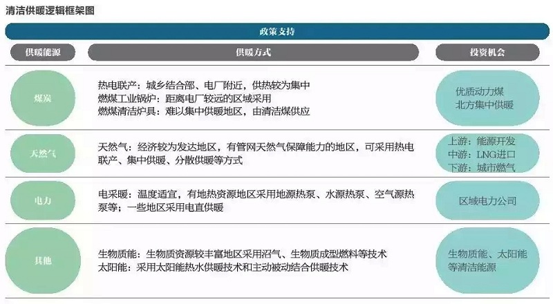 在操作層面,《規(guī)劃》已經(jīng)明確,參考城市和農(nóng)村供暖面積增速,按照整體供暖面積年均增速6%計(jì)算,預(yù)測到2021年,北方地區(qū)供暖面積約為276億立方米。按照清潔供暖面積不低于70%,具體目標(biāo)是:清潔燃煤集中供暖、天然氣供暖、生物質(zhì)能清潔供暖、電供暖(含空氣源熱泵等熱泵類)、地?zé)峁┡謩e達(dá)到110億、40億、21億、15億、10億平方米。