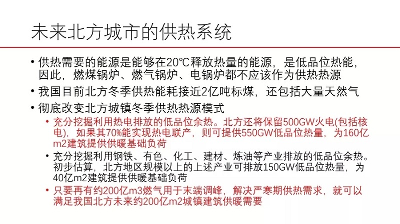 中國節(jié)能協(xié)會理事長、中國工程院院士江億在中國節(jié)能協(xié)會舉辦的“2018中國節(jié)能與低碳發(fā)展論壇”上強(qiáng)調(diào),中國“缺油少氣”的資源狀況使我們很難按照西方的路徑煤改油氣,我國必須發(fā)展可再生能源與核能為主的能源供給系統(tǒng),與發(fā)達(dá)國家同步。在未來北方城市的供熱系統(tǒng)中,供熱需要的能源是能夠在20℃釋放熱量的能源,是低品位熱能,因此,燃煤鍋爐、燃?xì)忮仩t、電鍋爐都不應(yīng)該作為供熱熱源。