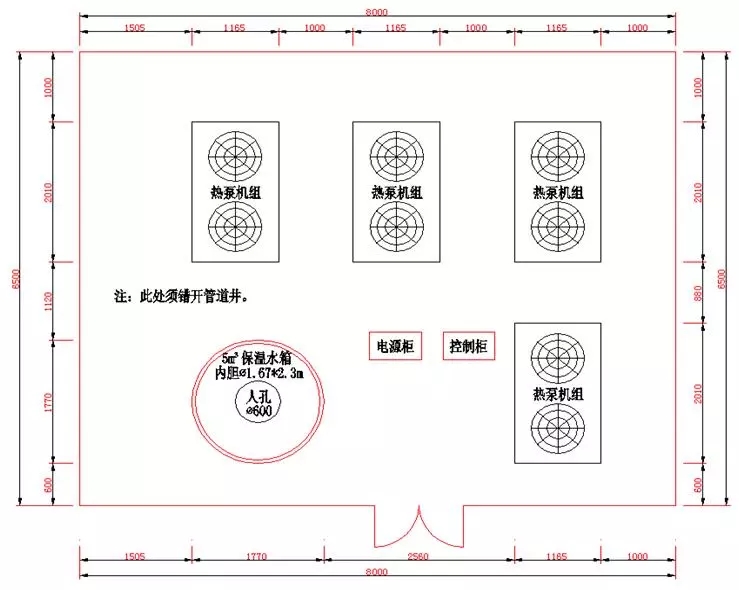 系統(tǒng)三占地面積8m×6.5m,共52m2,共布置4臺機(jī)組和1個(gè)5.0m3的保溫水箱,機(jī)組總制熱量為382kW,分別承擔(dān)8、10號樓的供熱負(fù)荷。如下圖。