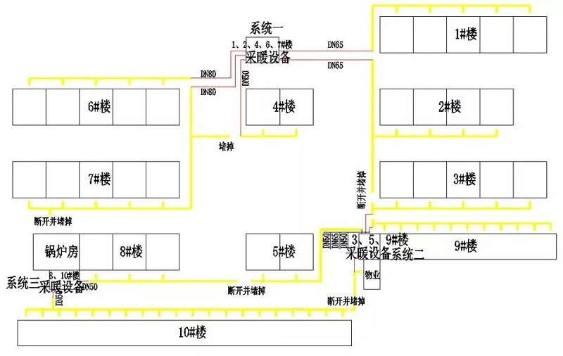 這個(gè)方案是想利用原燃煤室外供暖管網(wǎng),將原小區(qū)集中室外管網(wǎng)某部分截?cái)嘁环譃槿,將原室外綜合管網(wǎng)分為10個(gè)獨(dú)立的管網(wǎng),每棟樓通過獨(dú)立管網(wǎng)對應(yīng)的一臺循環(huán)泵,共選用10臺泵,再加上系統(tǒng)一中配置空氣源熱泵機(jī)組至水箱的2臺內(nèi)部循環(huán)泵,共12臺泵。如下圖所示。